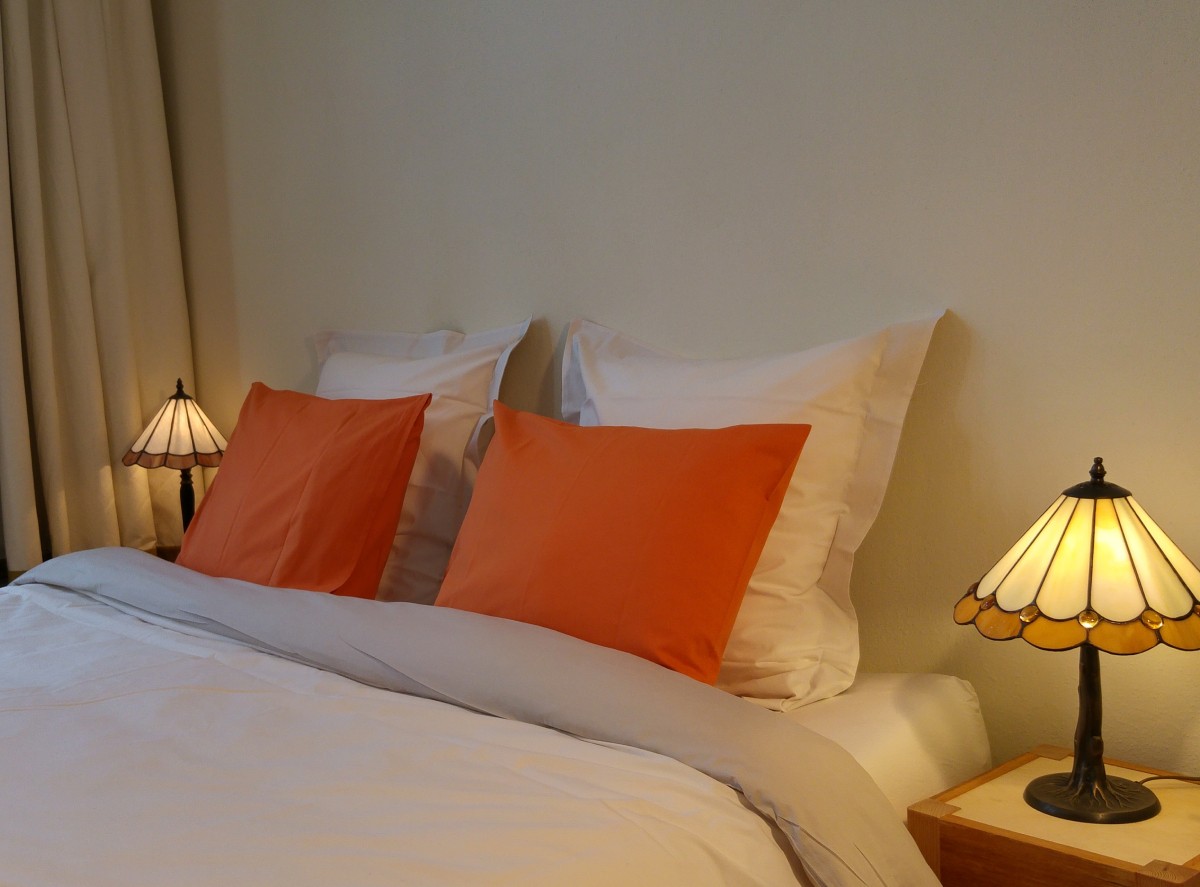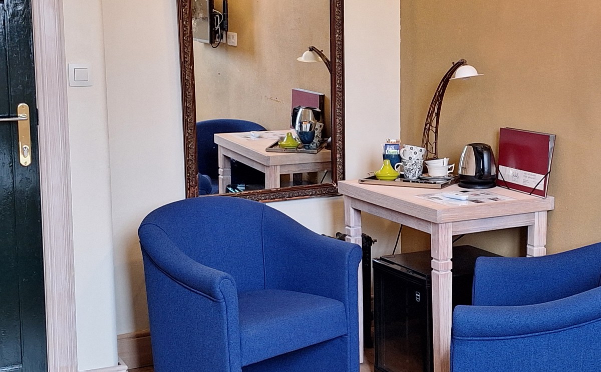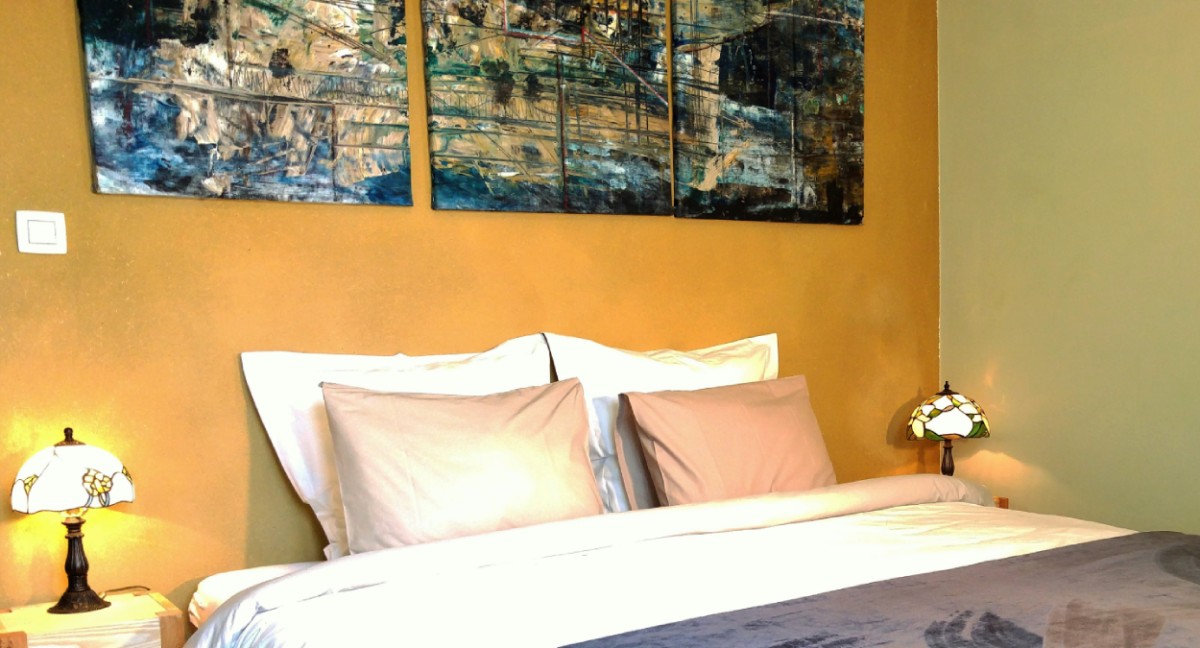 Ruime kamer onder het mansardedak met avondzon, kingsize bed en twee zetels. Leemwanden, houten vloer en zachte verlicht... Lees meer..